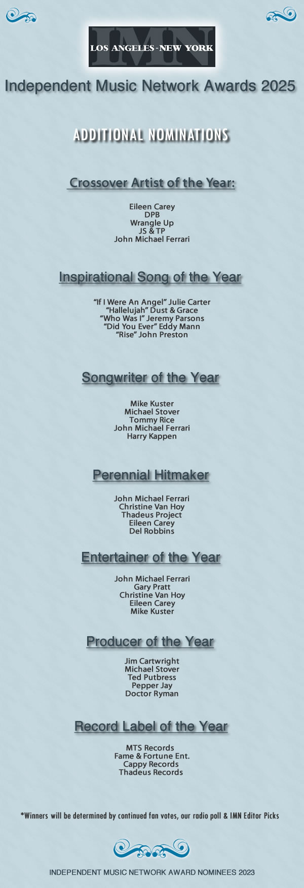 The Independent Music Network has announced the Nominations for our annual 2025 Independent Music Network Awards, honoring artists, bands & industry professionals.